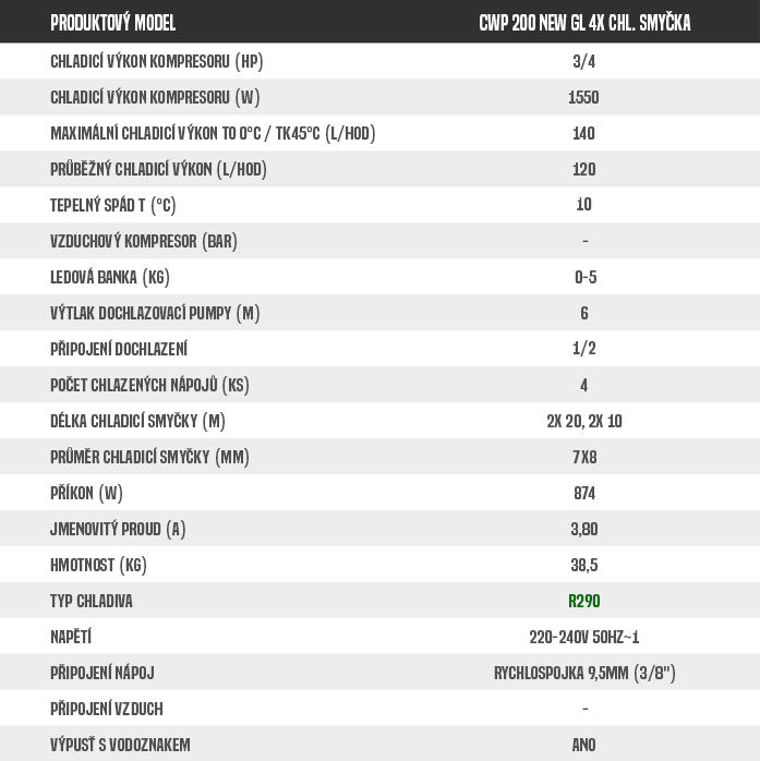 Podstolový chladič CWP 200 GREEN LINE NEW je profesionální zařízení kombinující výhody kontaktních a vodních chladičů tak, že k chlazení nápojového vedení využívá přímou energii výparníku, která nabízí konstantní výkon bez využití ledové zásoby. Díky těmto vlastnostem je možné zařízení rychle nachladit a zároveň udržovat konstantní teplotu při zvýšené výtoči. Počet smyček udává počet nápojů, které je možné současně chladit. Zakládáme si u něj na kvalitním zpracování a perfektním designu, ale i na vysokém výkonu při kompaktních rozměrech.