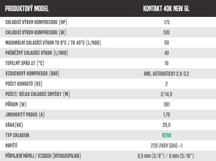 VÝKON – Výčepní zařízení KONTAKT 40/K NEW GREEN LINE svým zvýšeným průběžným výkonem 40-50 l/hod. umožňuje podávání zhruba 80-100 kvalitně vychlazených nápojů během jedné hodiny.