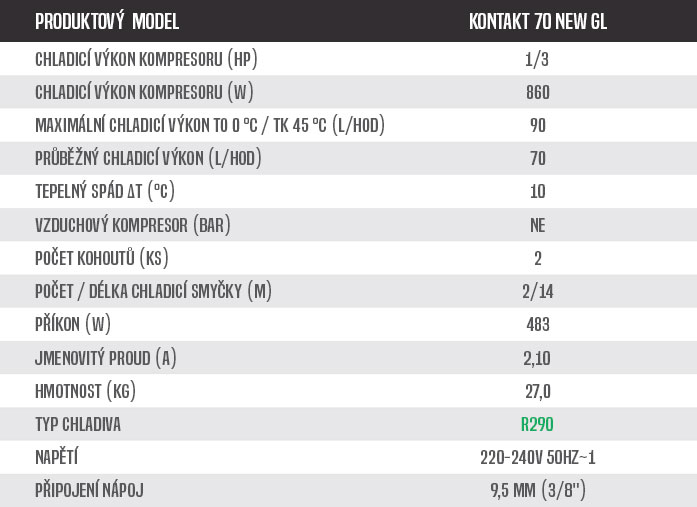 VÝKON – Výčepní zařízení KONTAKT 70 NEW GREEN LINE umožňuje zvýšeným průběžným výkonem 70-90 l/hod. podávání zhruba 140-180 kvalitně vychlazených nápojů během jedné hodiny.