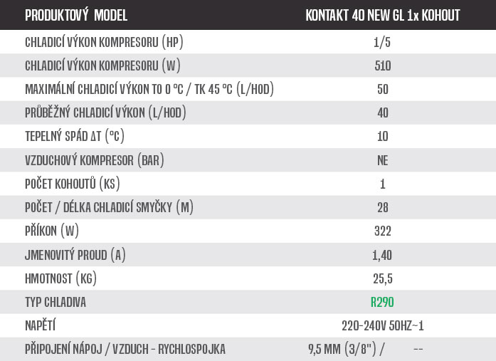VÝKON – Výčepní zařízení KONTAKT 40 NEW GREEN LINE 1x kohout svým zvýšeným průběžným výkonem 40-50 l/hod. umožňuje podávání zhruba 80-100 kvalitně vychlazených nápojů během jedné hodiny.